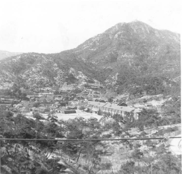 This photo taken from the top of a nearby hill showing our 352 C/R Compound. In the background you can see part of the nearby Korean village and Poo Ark San mountain which was nearby.