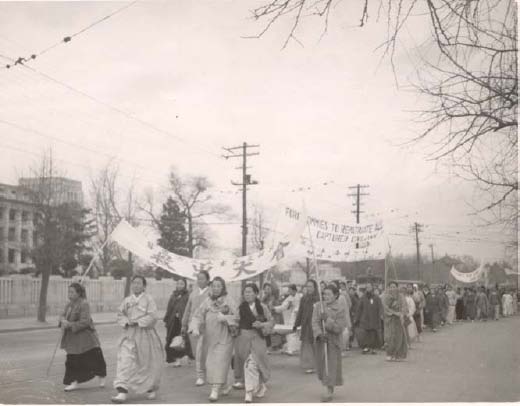 A demonstration of Korean War widows, protesting the armistice agreements, parading in front of the Capitol building. They were for forcing the Commies to free all captured civilians and instigating an immediate northward march to unify North and South Korea