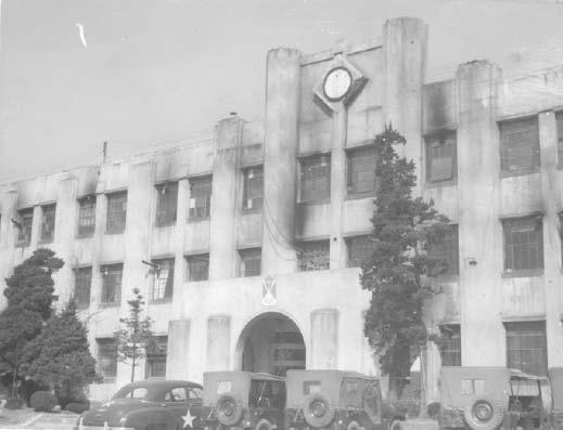 “501st Group” - One time Korean High School, now headquarters of the 501st ommunications Group, our Boss! It was damaged during the war – notice shell holes on face of building.