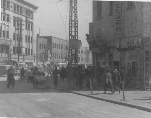 Street shot of downtown Seoul Seoul Korea Street shot of downtown Seoul. (Notice shell holes in face of store on the right)