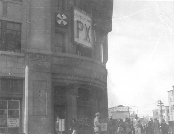 The main PX over here in Korea. It consists of four floors and handles almost everything in its stock. The PX is Located in the heart of downtown Seoul and is for the use of all United Nations personnel.