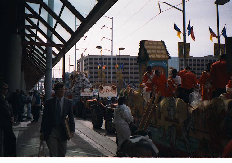 Floats preparing for parade These floats are being prepared for Mardi Gras.