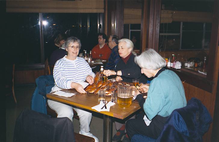 Bruning's with platter of crabs L - R Dorothy McCann Collins (still feeling too queasy to eat), Cecile McCann Isaacs, Cecile N. McCann (Mother)