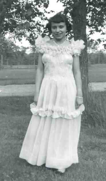 1952 Elizabeth Collins in prom dress at Hinckly Farm and Trade School