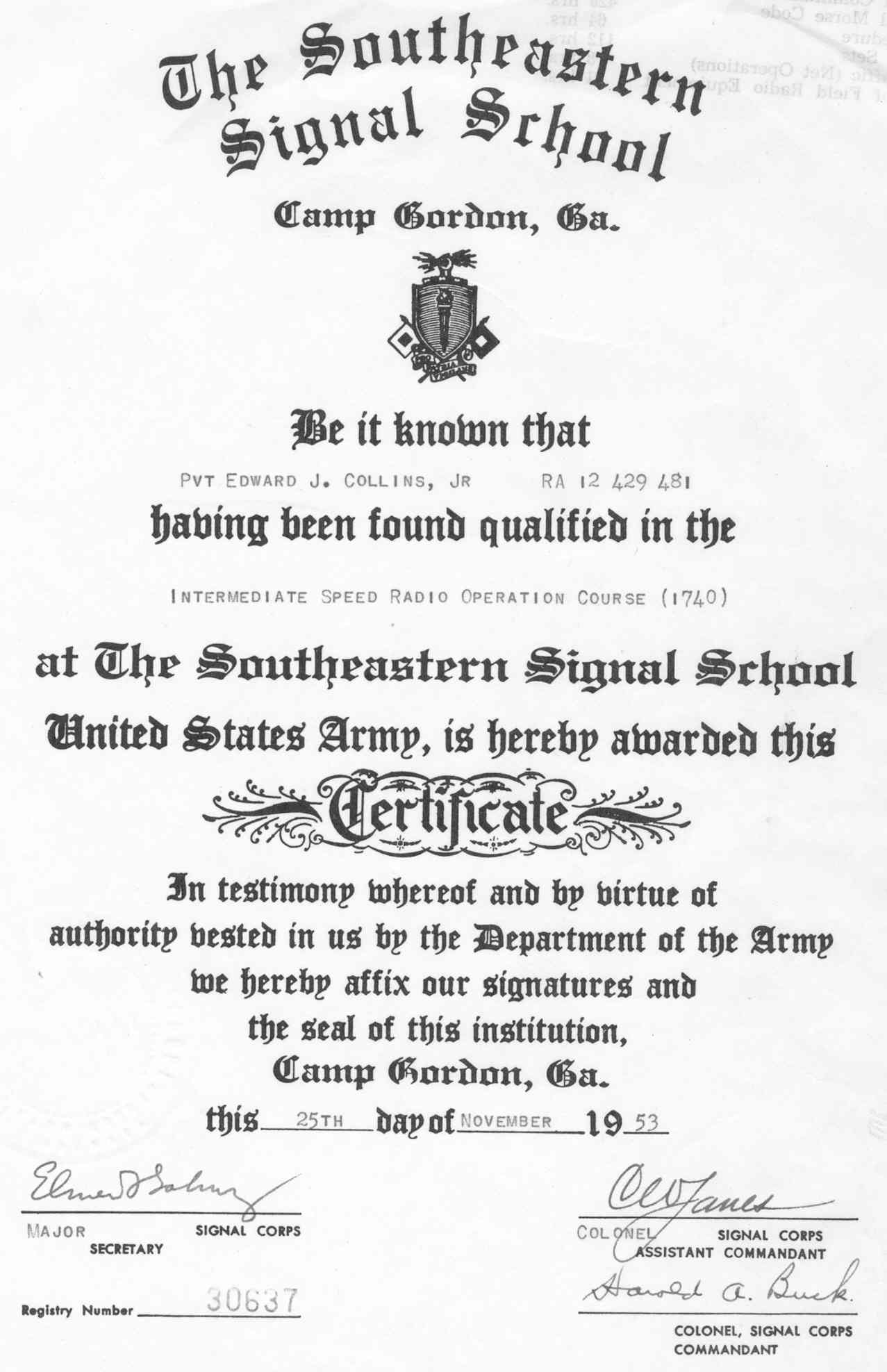 1953 Ed Collins, Jr. certificate from the Southeastern Signal School