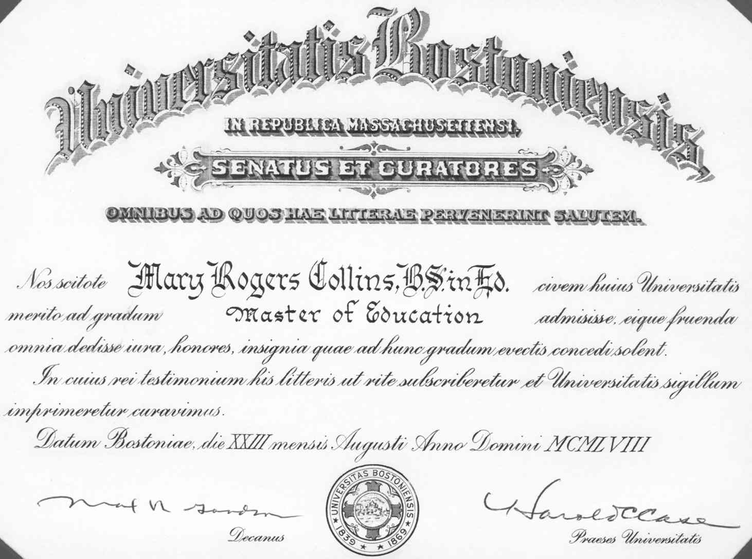 1958 Mary Rogers Collins Master of Education diploma Univ. of Boston