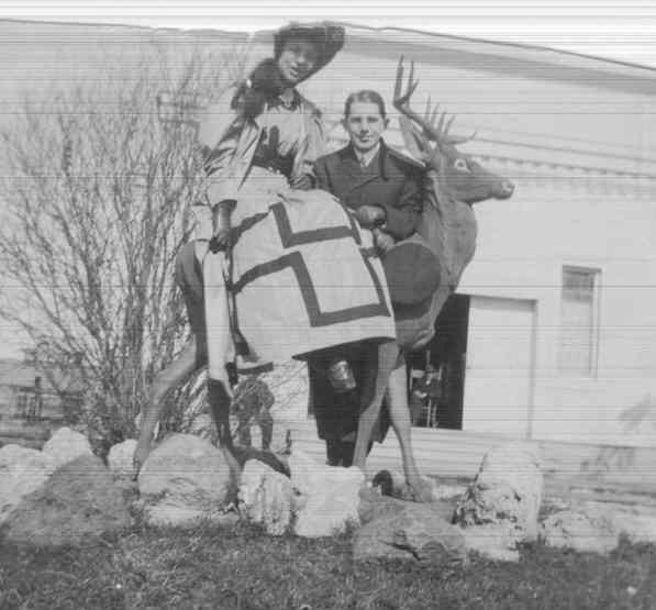 1906 Leona Reiman sitting on wooden deer with Sam Schwartz